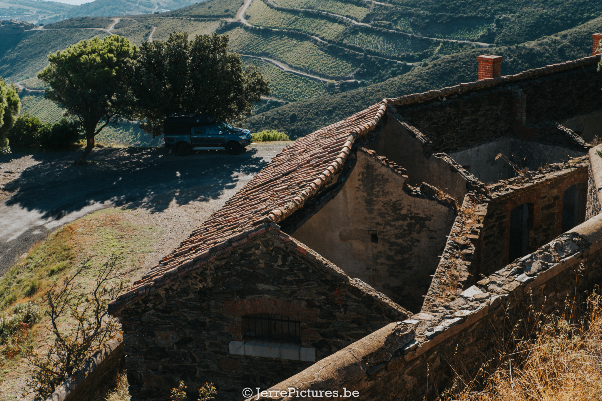 From this viewpoint, beside a weathered ruin (possibly a former barracks or storage building), a 270° panorama unfolds: the sunlit vineyards of Banyuls and Collioure rolling like a green carpet towards the sea, and yes — the Pyrenees rising in the background, with Spain somewhere beyond.